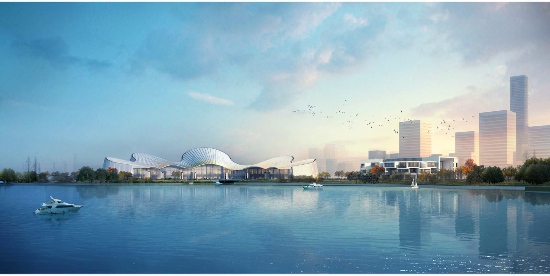 大劇院沿湖一側,起伏的屋面,舒展流暢,宛如兩架協奏的鋼琴,樂聲悠揚。又如一只翩翩起舞的紙鸞乘風欲起。